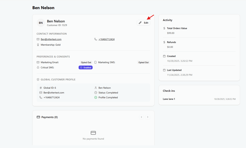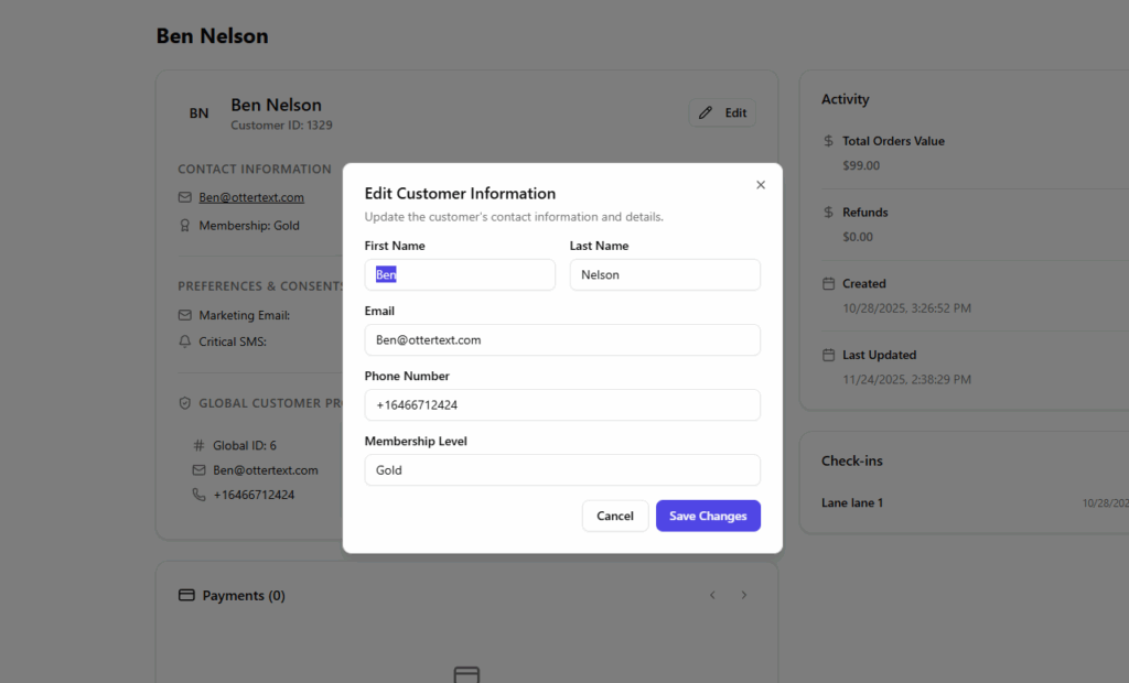 Preferences and consents are managed directly in the profile, so when a customer requests to opt in or out, staff can make the change from the same screen without leaving the page.